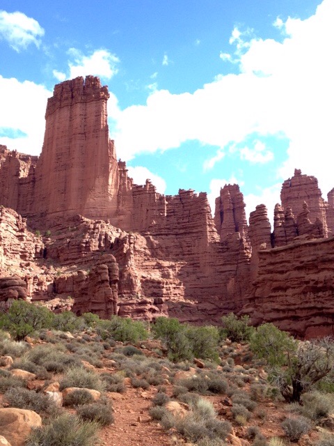 On to Fisher Towers!  These towers are isolated remnants of a 225 million-year-old floodplain deposit.  When the Colorado Plateau was uplifted, the salt deposits underlying the region buckled, and the erosion from that caused the exposure of Fisher Towers.
