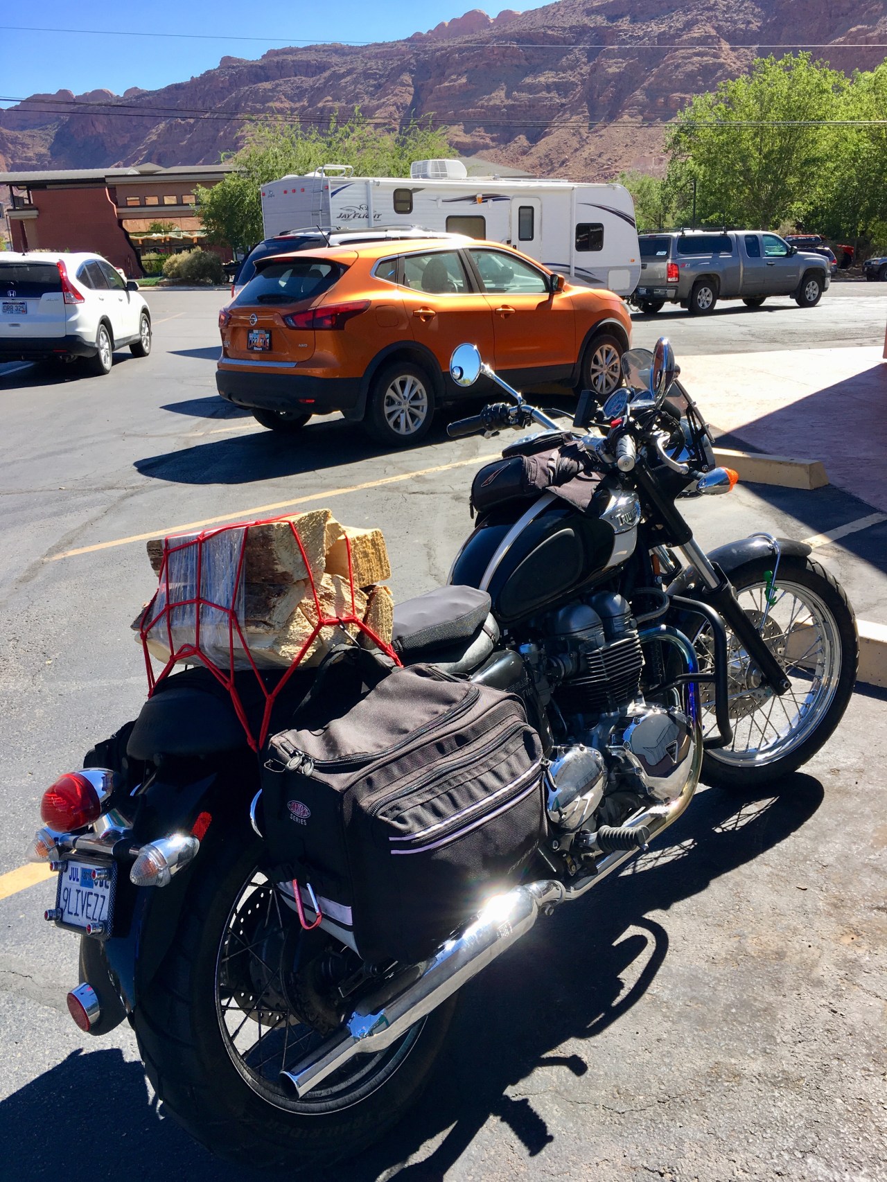 That night back at camp, I wanted to have a fire. I know, it’s hot–but you can’t camp without a campfire. So I loaded the Bonnie up with supplies from town, and headed 75 miles back to camp.
